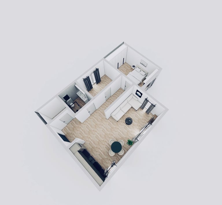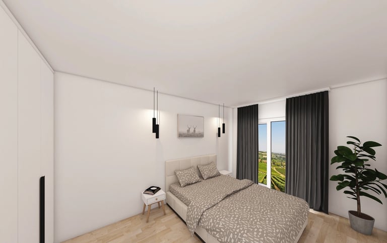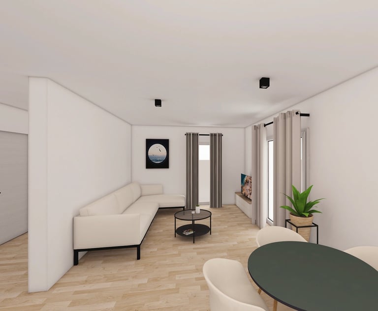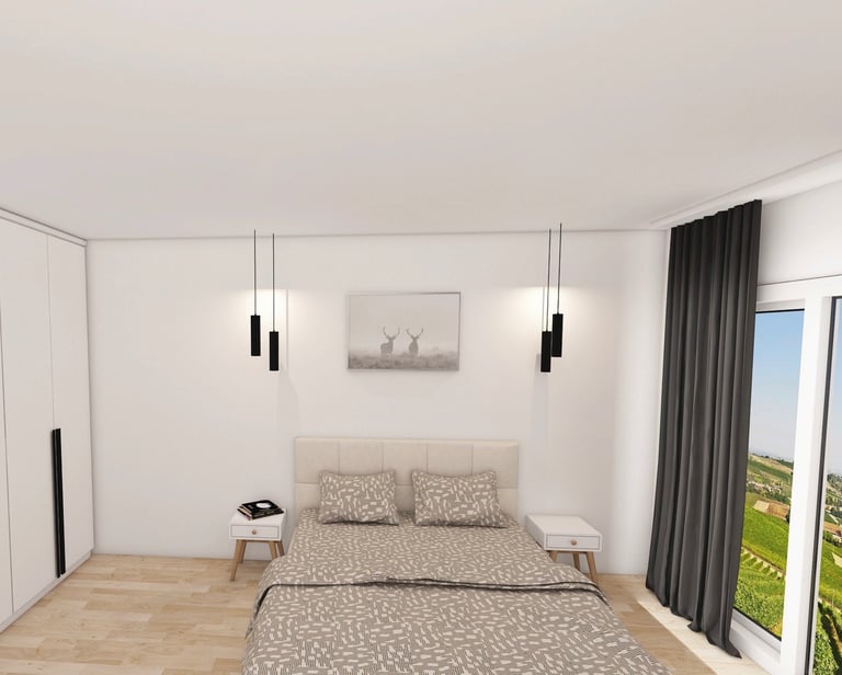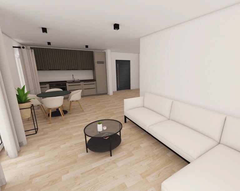 79 m² vidaus ploto leidžia patogiai suplanuoti net kelias gyvenamąsias zonas – čia tilps ne tik miegamasis, vaiko kambarys, svetainė su virtuvės erdve, vonios kambarys ir sandėliukas, bet ir papildomos funkcionalios zonos pagal šeimos poreikius.