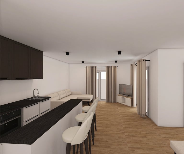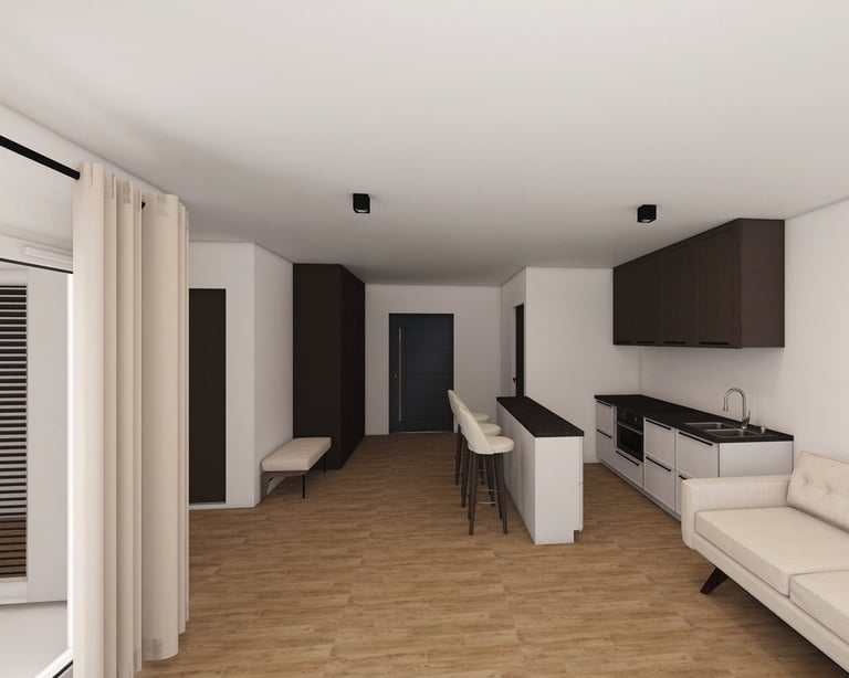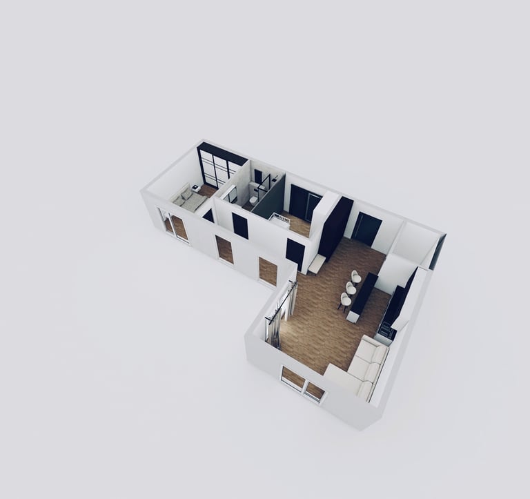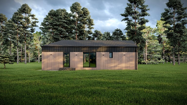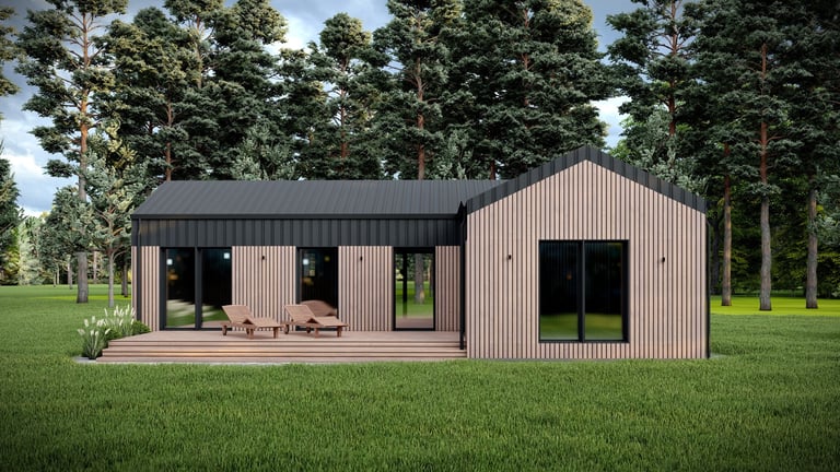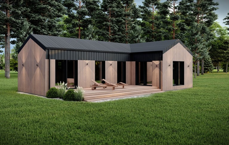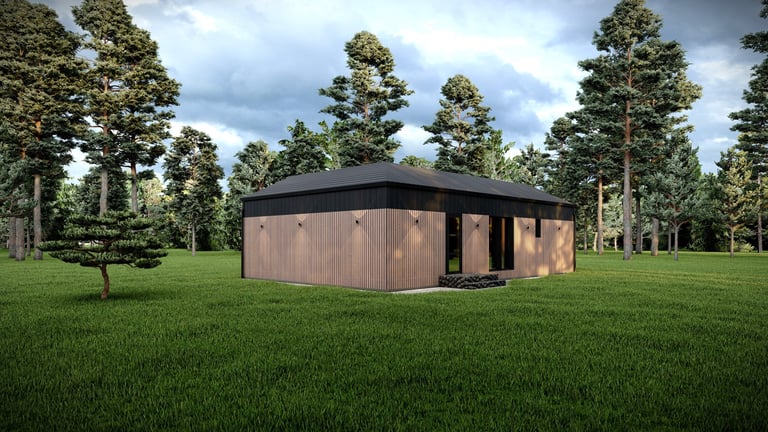 Modulinis namas „Žaltys“ – tai erdvus, išmaniai suplanuotas būstas, sukurtas gyvenimui visus metus. Dėl L formos konstrukcijos, namas natūraliai sukuria jaukų vidinį kiemelį ir išskirtinį vizualinį charakterį, išsiskiriantį tarp kitų modelių.